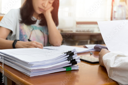 Business woman working at home with huge pile of document folders