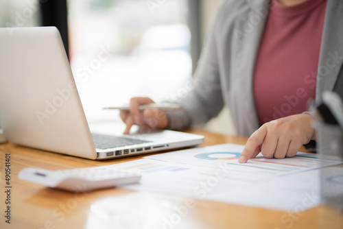 Business Woman working by using laptop computer Hands typing on a keyboard. Professional investor working new start up project. business planning in office. Technology business Concept