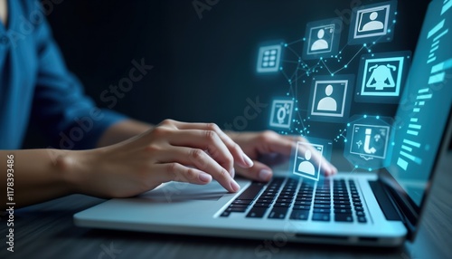 Business woman works on laptop. Virtual display shows chat app icons. Woman transfers information from laptop to mobile phone. Chatbot assistance, CRM tech support. Online work environment. Modern