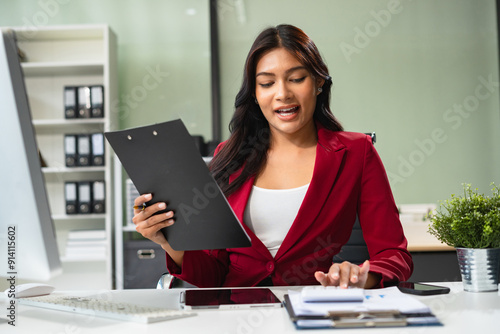 Business women hand working with tablet and laptop computer with documents on office desk in modern office.