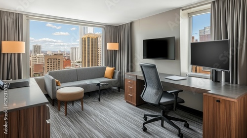 Business-class hotel suite with a large workspace, high-speed internet, and a professional setup