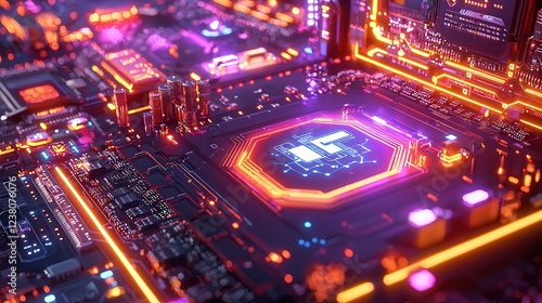 Businesses rely on cybersecurity for effective incident response. Futuristic circuit board with vibrant neon lights and intricate details.