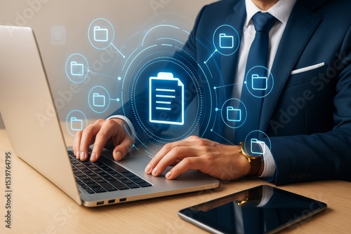 Businessman accessing digital document folders on laptop with futuristic holographic interface and glowing light technology background concept.