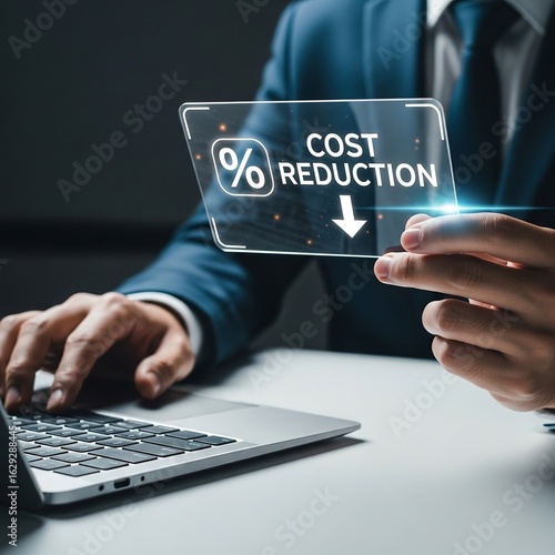 Businessman analyzes cost reduction strategy on a transparent digital screen with a downward arrow indicating savings