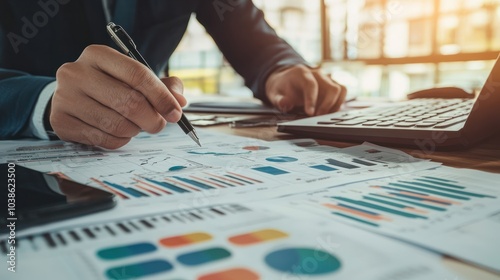 Businessman analyzing a marketing plan while an accountant calculates financial reports using a computer with graph charts Concepts related to business finance and accounting