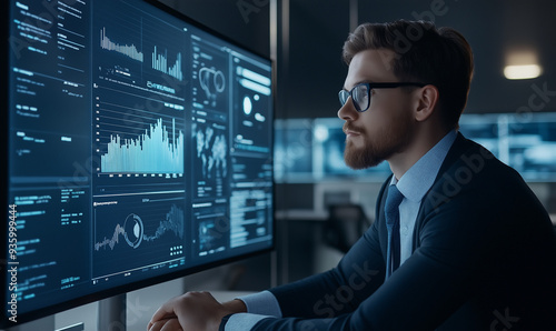 Businessman analyzing AI-powered data analytics on large screen with dynamic charts in modern office environment