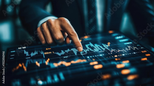 Businessman Analyzing Digital Data on Computer Screen with Abstract Finance Graphs, Concept of Information Communication and Stock Market Trends.