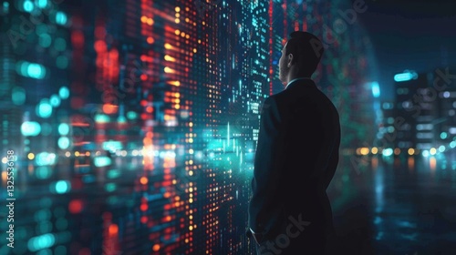 Businessman Analyzing Digital Data Visualization at Night Cityscape