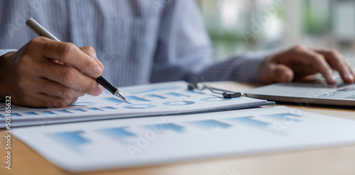 Businessman analyzing graphs working at office with laptop, tablet, and graph data documents on his desk.