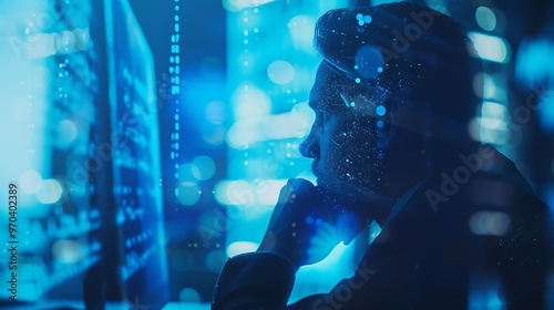 Businessman Analyzing Sales Trends on Digital Dashboard, Blue Theme with Copy Space