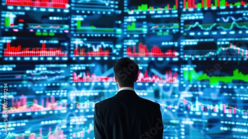 Businessman analyzing stock market data on multiple screens, focusing on financial trends and market performance in a data-driven environment.