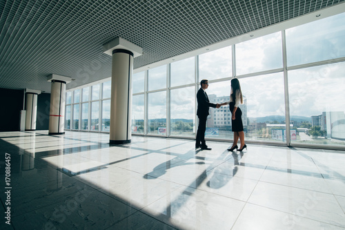 Businessman and businesswoman shaking hands together while standing in front of office building windows overlooking the city