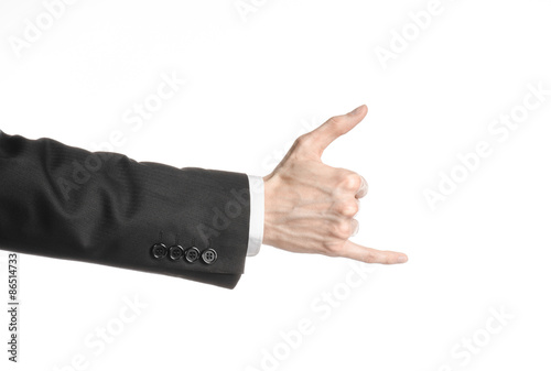 Businessman and gesture topic: a man in a black suit and white shirt showing hand gesture on an isolated white background in studio