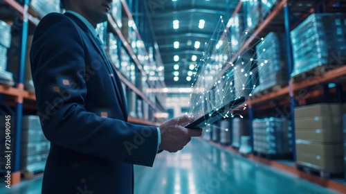 Businessman and global logistics network distribution and transportation, Smart logistics, Innovation future of transportation on large warehouse center