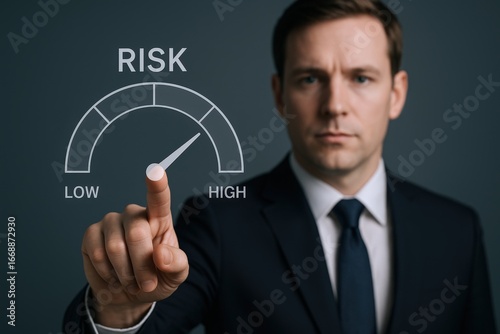 Businessman Assessing Risk Level on Virtual Gauge Display, Pointing to Indicator for Business Strategy