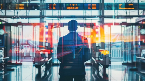 businessman back view at airport gate (close up, focus on, copy space) vibrant gate and signage, double exposure silhouette with travel routes