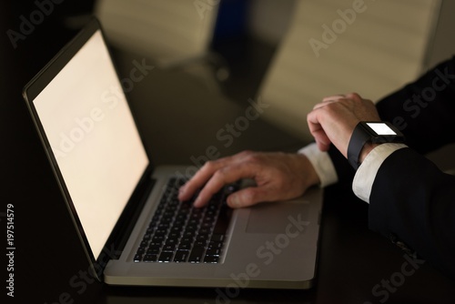 Businessman checking time while using a laptop at office desk