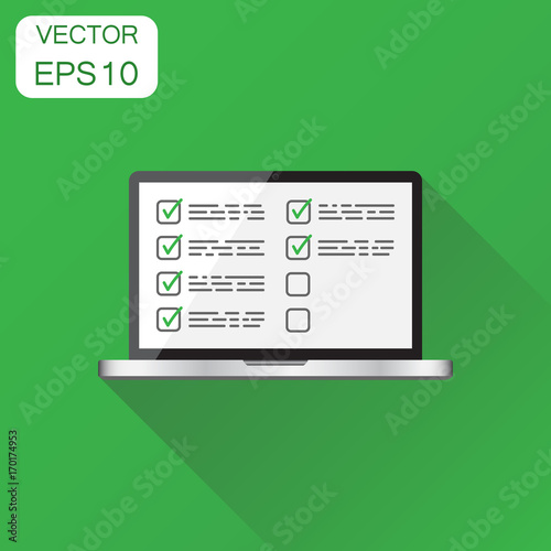 Businessman checklist with laptop icon. Business concept checklist, task list pictogram. Vector illustration on green background with long shadow.