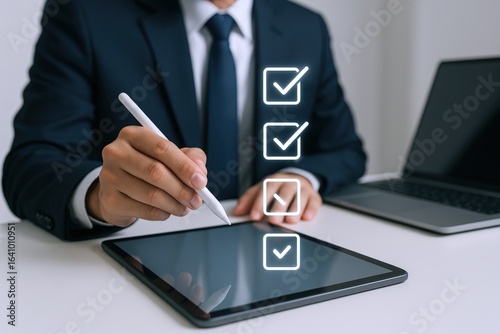 Businessman Completing Checklist on Digital Tablet with Stylus, Illustrating Task Management and Digital Workflow