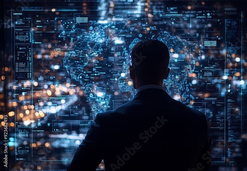 businessman controlling a global network of offices and partners via data streams and holographic interfaces