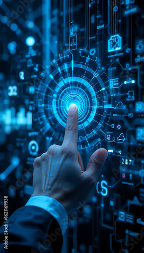 Businessman digitally interacts with a virtual screen, pressing a futuristic button to connect with global data networks