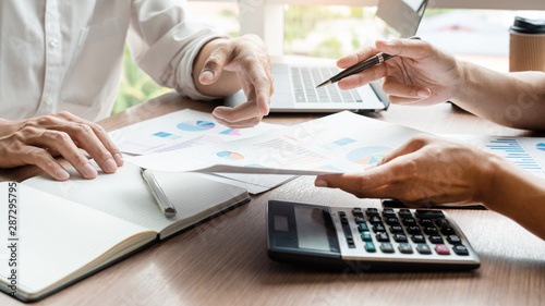 businessman discuss explaining new trends information on a document with colleague co-worker or partner together in a modern business office.