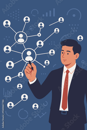 Businessman drawing global network structure, customer connection, CRM, data exchange, business leadership, recruitment, HR, teamwork, corporate communication, human resources management