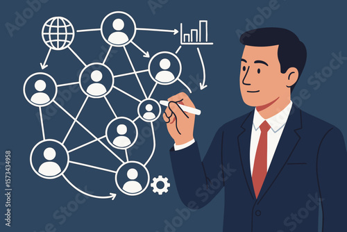 Businessman drawing global network structure, customer connection, data exchange, CRM, client service, digital marketing, business communication, social media strategy