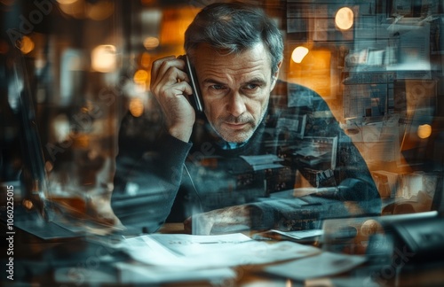 Businessman Engaged in Phone Conversation While Taking Notes in Double Exposure