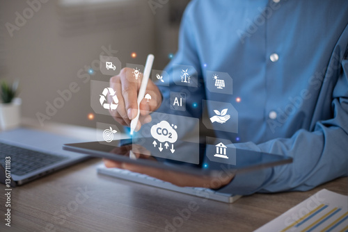 Businessman examines and solves world problems. CO2 concept that represents the problem of carbon dioxide emissions and turns to environmental technology and renewable energy. Sustainable development.