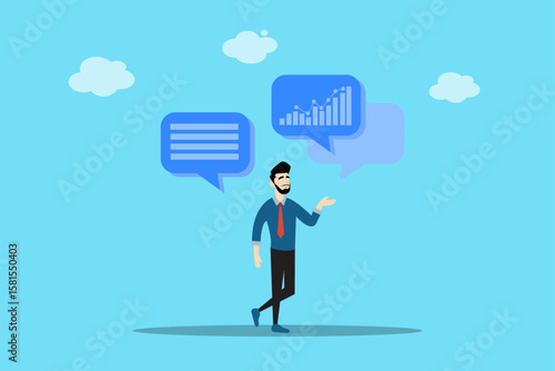 Businessman explaining with chat bubbles showing text and graph. Great for business communication, analytics, and digital presentation themes.