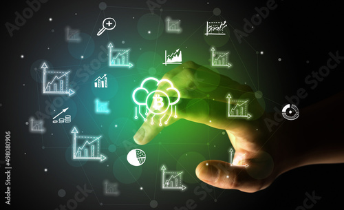 Businessman finger touching on screen multimedia interface with hand drawn currency icons