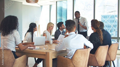 Businessman Giving Presentation To Business Team Sitting Around Table In Modern Office