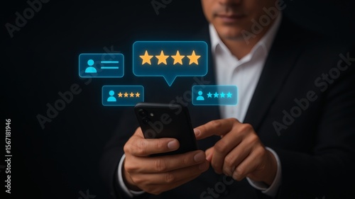 Businessman giving star rating using smartphone, customer feedback and user review system with glowing futuristic interface