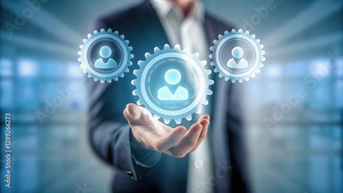Businessman Gripping Holographic Symbols Representing Connections and Collaboration in a Modern Work Environment