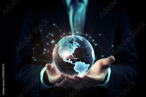 Businessman Hand Holding a Technology Hologram of the Globe of Earth With Polygonal Locations - Generative AI