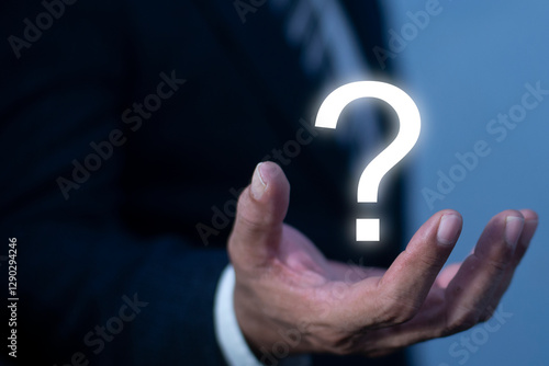 Businessman hand holding question mark. concept of Question mark Business FAQ, Thinking, Ask quiestion online