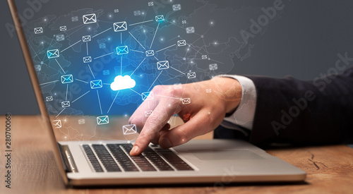 Businessman hand sending a bunch of messages on laptop with cloud computing concept