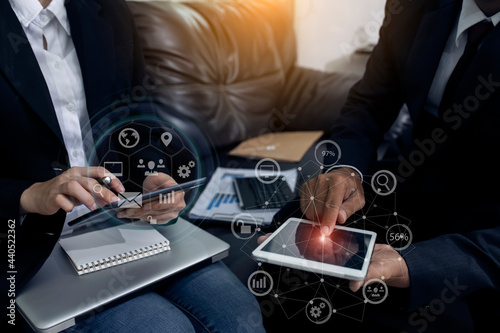 Businessman hands working on network and digital finance marketing chart with future technology innovation and digital transformation concept.