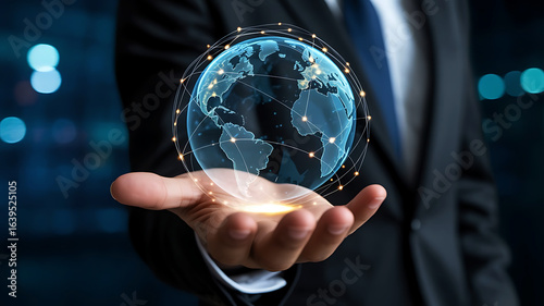 Businessman holding a glowing digital globe with interconnected lines representing global network and technology