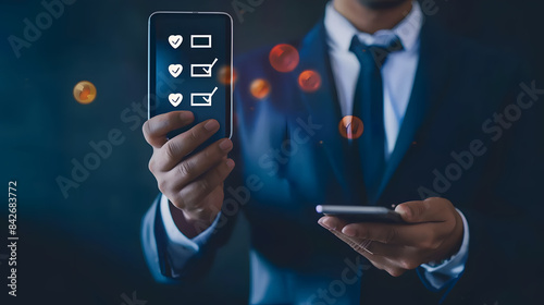 Businessman holding a mobile phone checking a list with mark icons on a virtual screen.depicting a business concept for an online questionnaire