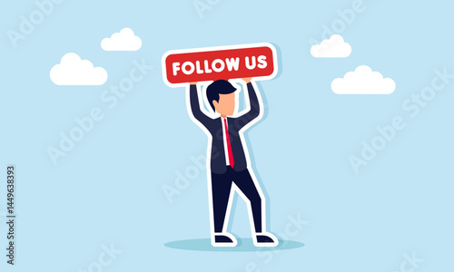 Businessman holding a sign that says follow us, illustration of a call to action or campaign to follow a social media account