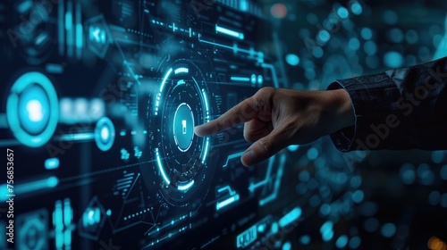 Businessman holding a virtual hologram icon with text "AI" in his hand and digital glowing technology in the style of a futuristic concept