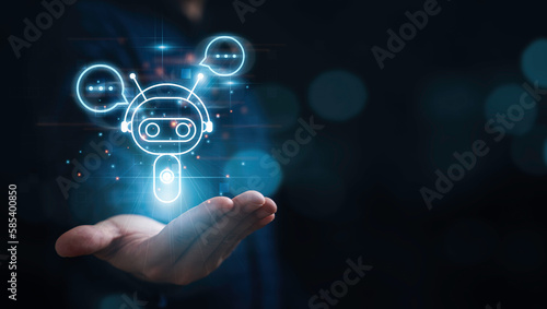 Businessman holding artificial Intelligence digital chatbot icon with message for AI innovation technology to provide information data concept.