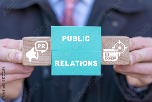Businessman holding colorful blocks with conceptual banner: PUBLIC RELATIONS. PR Public Relations concept. Communication advertising marketing strategy.