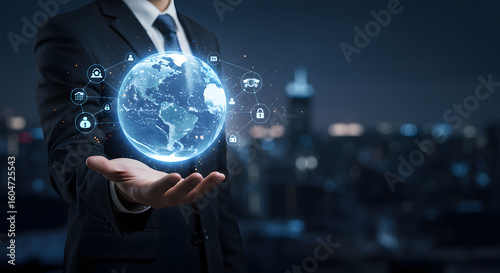 Businessman holding illuminated globe representing global connectivity and digital networks