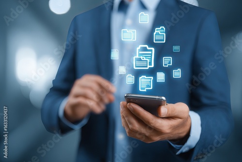 Businessman holding phone with digital folders
