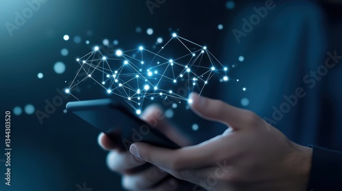 Businessman holding smartphone with glowing network of connections emerging, representing global communication and technological innovation in modern business world