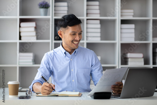 Businessman in a startup office, he is working on management and marketing planning for a leading and leading growth company, managing with young people who think differently. Startup company concept.