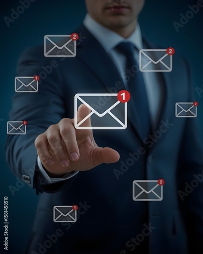 Businessman in a suit touching virtual envelope icons with notification symbols, symbolizing corporate email communication, message alerts, and digital contact in modern business.